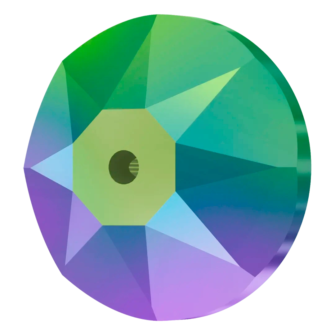 Swarovski sew on crystals Xirius Lochrose (3188) in Crystal Scarabaeus Green are round flat backed crystals that come with a thread hole, enabling the crystals to be sewn onto fabric. Xirius Lochrose has a flat back that has one hole in the centre enabling the crystal to be easily sewn onto any type of textile or accessory. Its rounded edges guarantees thread protection making them suitable for any type of fabric embellishment.